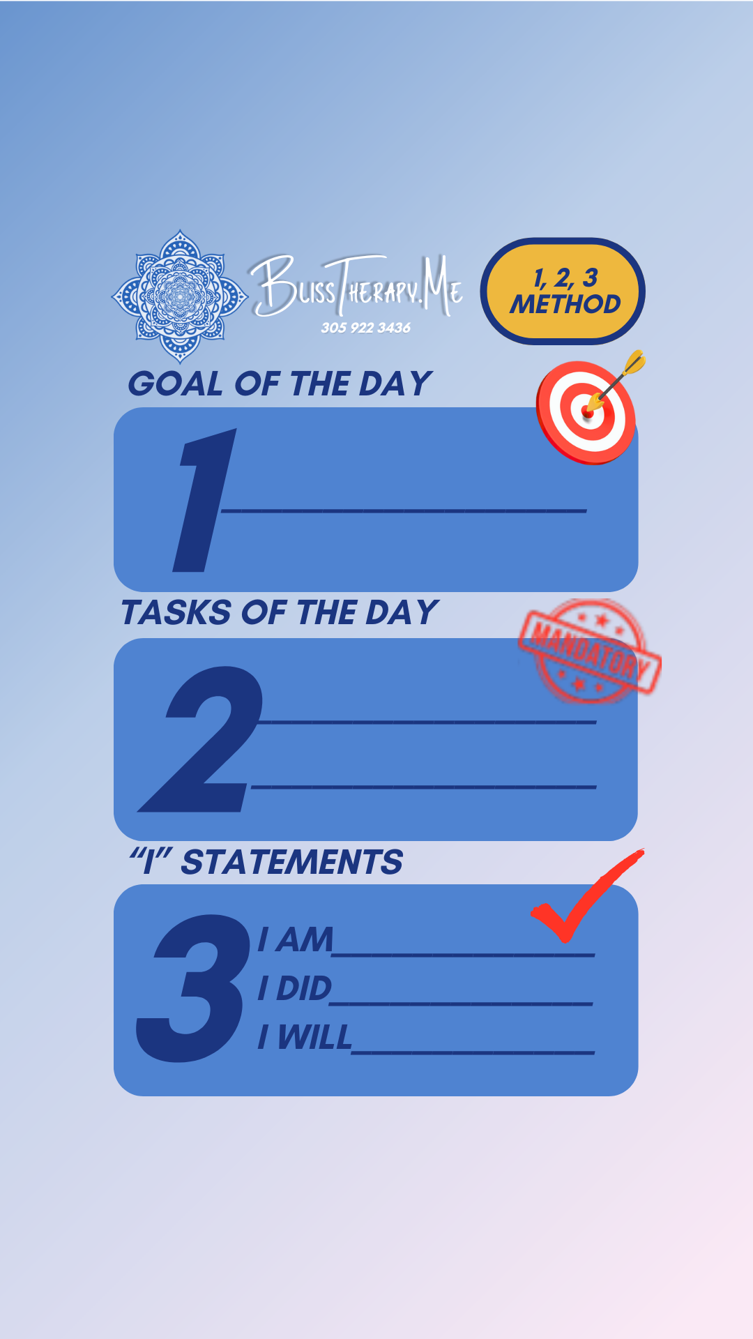 At BlissTherapy.me, we believe that small, daily habits create lasting change. That’s why Dr. Dominique designed the 1, 2, 3 Method—a simple yet powerful daily practice to bring clarity, focus, and encouragement into your day.